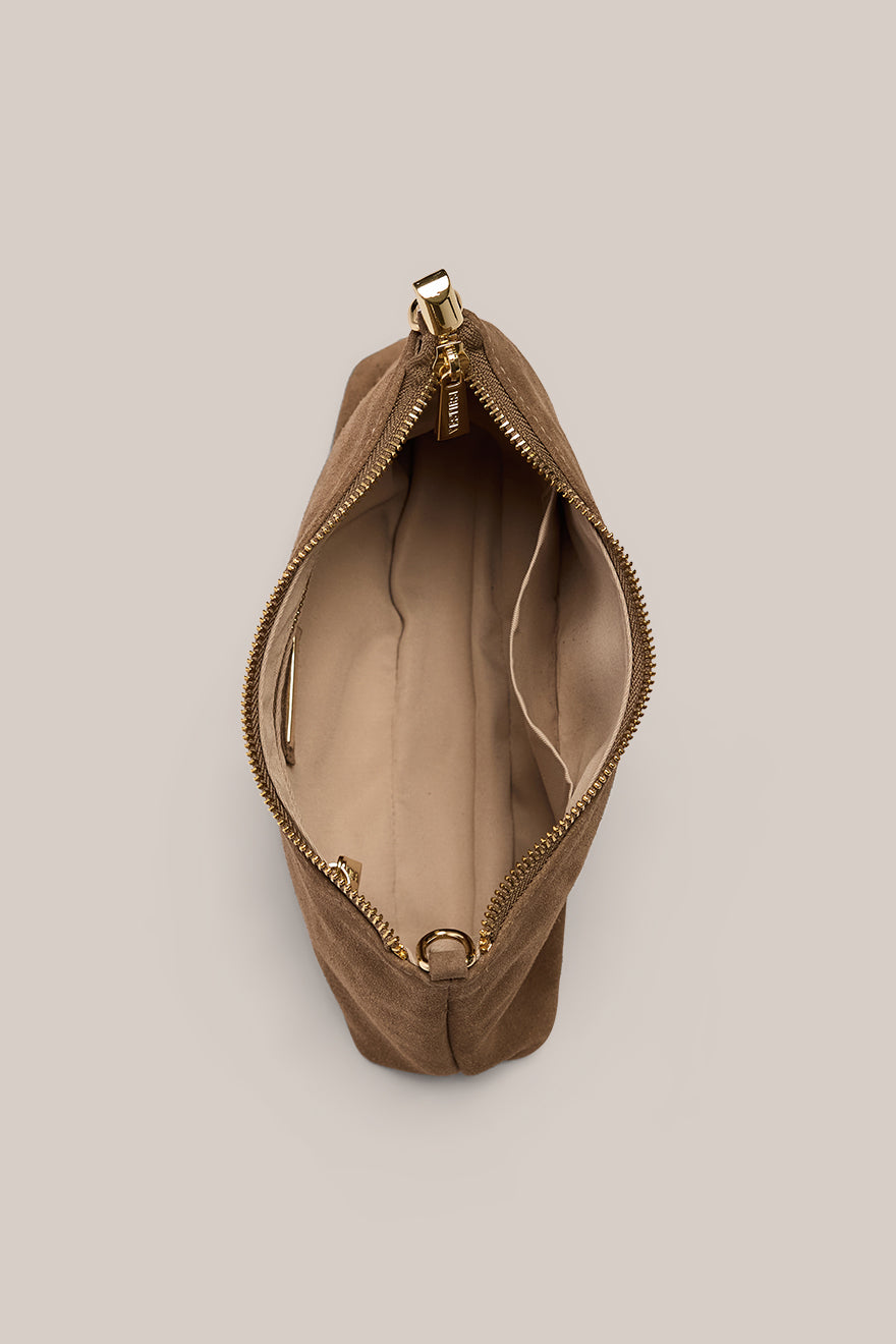 Its rich suede body is complemented by polished gold hardware, a smooth zip closure, and a thoughtfully designed interior with a pocket for your valuables. Compact yet deceptively spacious, it fits your daily essentials (phone, sunglasses, keys, and a small wallet) with understated ease.