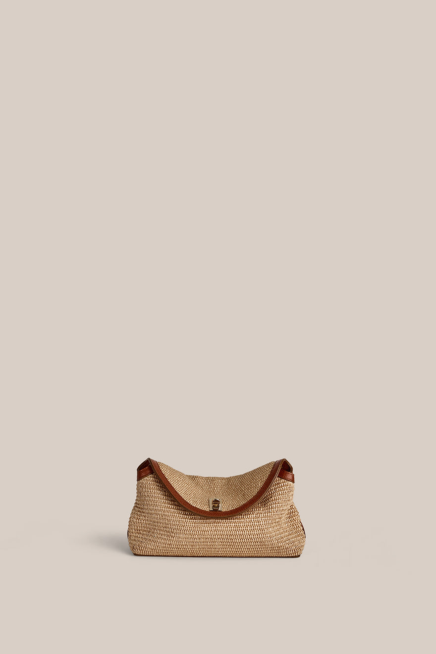 Introducing the Sloane Mini Resort Crossbody Clutch, a warm-weather interpretation of our signature silhouette. Our woven raffia-style material brings natural texture and lightness, balanced with tan leather accents and our iconic gold turnlock closure.